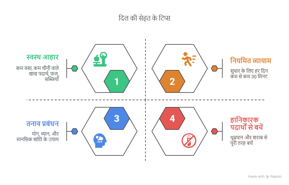 हृदयाघात के बाद, डॉक्टर आपको अपने लाइफस्टाइल में कुछ महत्वपूर्ण बदलाव करने की सलाह देंगे, जैसे कि तंबाकू से बचना, स्वस्थ आहार लेना, नियमित व्यायाम करना, और तनाव को नियंत्रित करना।