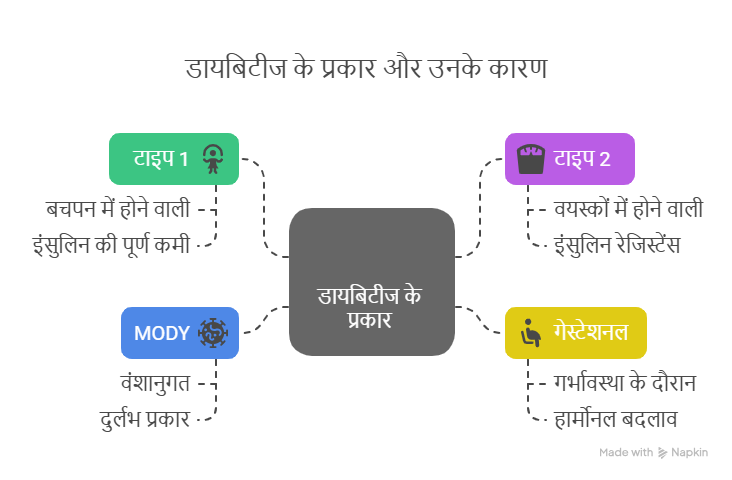 डायबिटीज मुख्य रूप से चार प्रकार की होती है: टाइप 1 डायबिटीज, जो बचपन में होती है और जिसमें शरीर इंसुलिन नहीं बनाता; टाइप 2 डायबिटीज, जो वयस्कों में आम है और जिसमें इंसुलिन का उपयोग प्रभावी नहीं होता; गेस्टेशनल डायबिटीज, जो गर्भावस्था के दौरान होती है; और MODY, जो एक वंशानुगत और दुर्लभ प्रकार है।